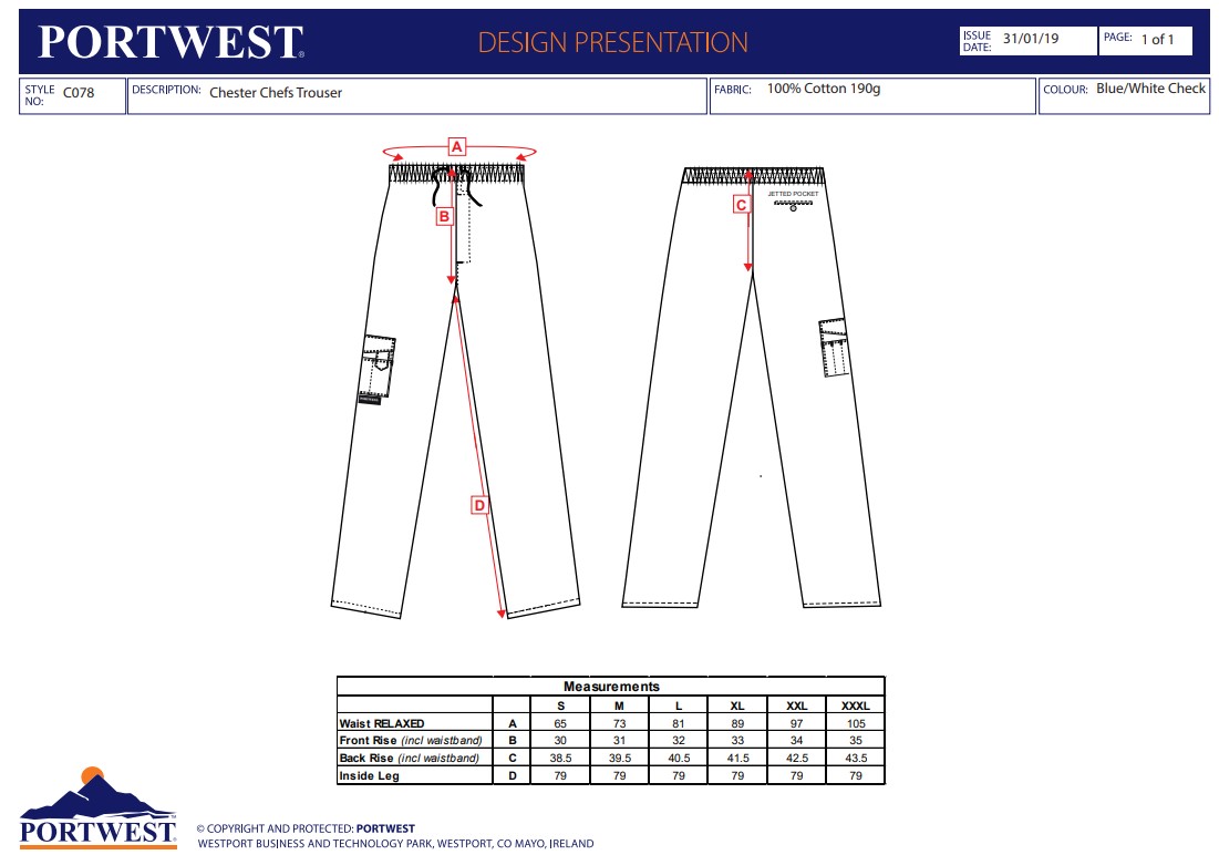 Portwest C078 Chester Chefs Trousers C078