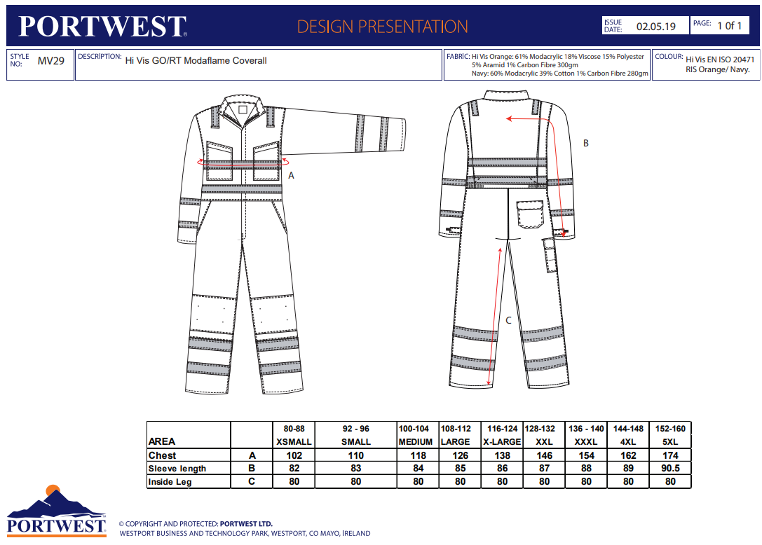 Datasheet - https://documents.portwest.com/datasheet.php?style=MV29&lang=GB&itemcol=MV29ONR&facility=902