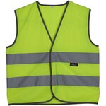 Hi visibility childs safety vest made from 100% polyester tricot material.Velcro front fastening.Packed in a small pouch with velcro for easy carrying